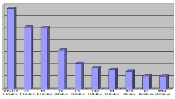 油漆涂料頂級(jí)品牌公司整合并購(gòu)加劇,并加速亞洲市場(chǎng)的開發(fā),尤其是中國(guó)市場(chǎng),阿克蘇諾貝爾牢牢占據(jù)領(lǐng)先位置,居全球的第1,得益于收購(gòu)帝國(guó)化學(xué)ICI,雖然在出售了英國(guó)涂料公司王冠crown。PPG收購(gòu)式馬卡龍進(jìn)一步鞏固了市場(chǎng)地位。RPM加大內(nèi)部品牌整合力度。鉆石涂料在收購(gòu)四季涂料和弗羅斯特涂料,排名躍居世界的第9。世界十大油漆涂料品牌公司排名:表1