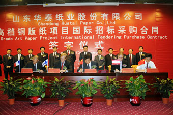 6月17日,華泰紙業(yè)45萬(wàn)噸高檔銅版紙項(xiàng)目國(guó)際招標(biāo)采購(gòu)合同簽字儀式在華泰工業(yè)園舉行。東營(yíng)市市委常委、廣饒縣縣委書(shū)記趙豪志,縣長(zhǎng)田和友,市經(jīng)貿(mào)委副主任龍艦,縣委常委、大王鎮(zhèn)黨委書(shū)記楊同賢等政府領(lǐng)導(dǎo),集團(tuán)董事長(zhǎng)李建華,以及中標(biāo)單位美卓造紙與紙漿總裁Bertel、安德里茲亞洲區(qū)副總裁Gary、ABB亞太區(qū)域銷售經(jīng)理Jean—christophe bussolaro、長(zhǎng)沙長(zhǎng)泰輸送包裝設(shè)備有限公司總經(jīng)理簡(jiǎn)澤豐等出席簽字儀式。儀式由山東齊信招標(biāo)公司趙欽軍經(jīng)理主持。