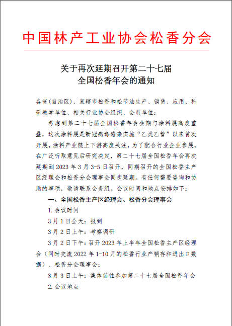 關(guān)于再次延期召開第二十七屆全國(guó)松香年會(huì)的通知