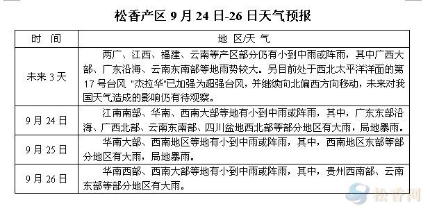 華訊松香網(wǎng)溫馨提醒:未來(lái)三日,桂粵閩贛滇等大部地區(qū)將迎來(lái)小到中雨或陣雨,局部地區(qū)雨勢(shì)較大。另受南下冷空氣及臺(tái)風(fēng)“杰拉華”共同影響,部分沿海地區(qū)或?qū)⒂瓉?lái)大風(fēng)降溫天氣。隨著季節(jié)深入,各產(chǎn)區(qū)晝夜溫差將有所加大,加上部分地區(qū)降雨天氣的影響,采脂工人的上山或有所受阻。脂價(jià)方面,今日廣西、云南局部脂價(jià)略有上調(diào),但部分松脂供應(yīng)商卻因此而滋生惜售心理,綜上,預(yù)計(jì)本周松脂量或難明顯放大。