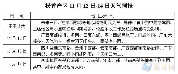 華訊松香網溫馨提醒:未來三日,桂滇閩黔瓊等地以晴或陰天為主,局部伴有小到中雨或陣雨,上述地區(qū)降水量較往年同期偏多,松脂采收工作及松脂質量稍受影響。本周,江西、福建等地最后一批松脂或能繼續(xù)釋放,兩廣等地產區(qū)或維持上周緩慢流出狀態(tài),云南地區(qū)采脂工積極性仍不高,或難以有效放大。