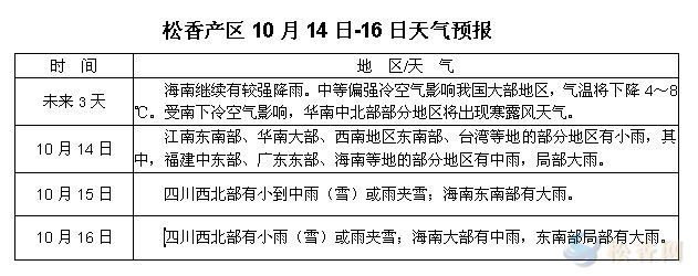 華訊松香網(wǎng)提醒:未來三天海南持續(xù)有較強(qiáng)降雨,其他部分產(chǎn)區(qū)則受中等偏強(qiáng)冷空氣影響有較大幅度降溫。隨著秋季深入,天氣轉(zhuǎn)涼,加上松香市場(chǎng)低迷,湖北部分地區(qū)采脂提前結(jié)束,其他產(chǎn)區(qū)也將受天氣變冷及市場(chǎng)低迷等因素的綜合影響,出現(xiàn)松脂量有所減少或產(chǎn)季提前結(jié)束等現(xiàn)象。