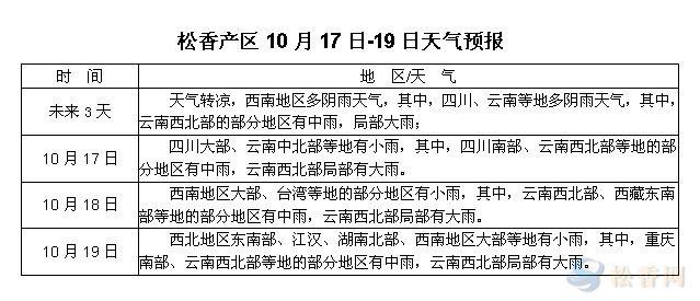 華訊松香網(wǎng)提醒:未來三天兩廣、江西福建等松香主產(chǎn)區(qū)秋高氣爽,除了晝夜溫差較大之外,天氣情況較好。值得關注的是西南地區(qū)多陰雨天氣,屆時云南、四川等地降水持續(xù),尤其云南多地受雨水天氣影響,松脂量或將不會大量釋放,但是否對會在松香市場整體走勢有所影響,有待觀察。