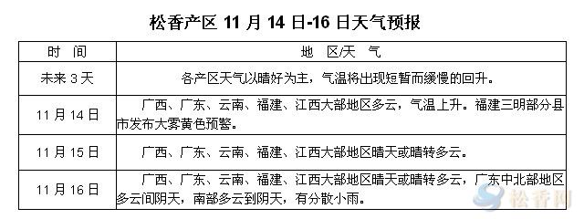華訊松香網(wǎng)提醒:未來(lái)三天,各松香產(chǎn)區(qū)天氣以晴好為主,氣溫將出現(xiàn)短暫而緩慢的回升。兩廣、江西、福建等產(chǎn)區(qū)產(chǎn)季接近尾聲,晴好天氣利于松脂采收和運(yùn)輸,隨著最后一批松脂陸續(xù)出來(lái),工廠可持續(xù)正常收脂。
