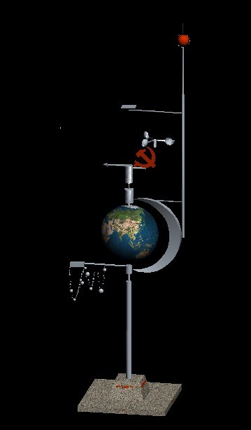 在采訪中,潘永鑫還提了一件令其興奮的事情。去年,在改革開放30年的日子里,他加入了中國共產(chǎn)黨,成為一名黨員。作為表達(dá)對黨的忠誠及改革開放30年的獻(xiàn)禮,他特設(shè)計了“黨徽風(fēng)向標(biāo)”城市雕塑。首先,他考慮了主體構(gòu)件:主軸、地球與月球模型、黨徽風(fēng)向器、黨徽風(fēng)速器。主軸蘊(yùn)含著世界發(fā)展的主題:和平與發(fā)展,構(gòu)建和諧世界。它的下面鐫刻“向改革開放三十年獻(xiàn)禮”字樣,以此凸顯設(shè)計的主旨。地球與月球模型意味著綠色地球,和諧太空都是全人類共同的家園。在它們的上方,承接著風(fēng)向器、風(fēng)速器和黨徽,表示黨始終以全球思維,站在世界的高度,敏銳測控著風(fēng)向和風(fēng)速,深刻了解世界形勢的發(fā)展。然后,他設(shè)計了附件:避雷針、指南針和56個小球。避雷針連接在月球模型上,隱喻“在風(fēng)雨雷電交加的日子,黨時刻關(guān)注民生,時刻保護(hù)著人民群眾的安全”;指南針連接在避雷針中央,含“黨領(lǐng)導(dǎo)全國人民走改革開放之路,方向目標(biāo)明確而堅定不移”之意;56個小球掛在地球模型下方,示意56個民族在中國共產(chǎn)黨領(lǐng)導(dǎo)下,團(tuán)結(jié)一心,為實(shí)現(xiàn)中華民族的偉大復(fù)興而努力奮斗。取材不銹鋼的整體構(gòu)件緊密相連,隨風(fēng)而動。最后,他把這個設(shè)計的名稱叫做“黨徽風(fēng)向標(biāo)”。圖紙設(shè)計完畢,他又花了好幾天時間把模型做了出來?,F(xiàn)在,這個“黨徽風(fēng)向標(biāo)”就矗立在永新機(jī)械廠大樓的頂上。