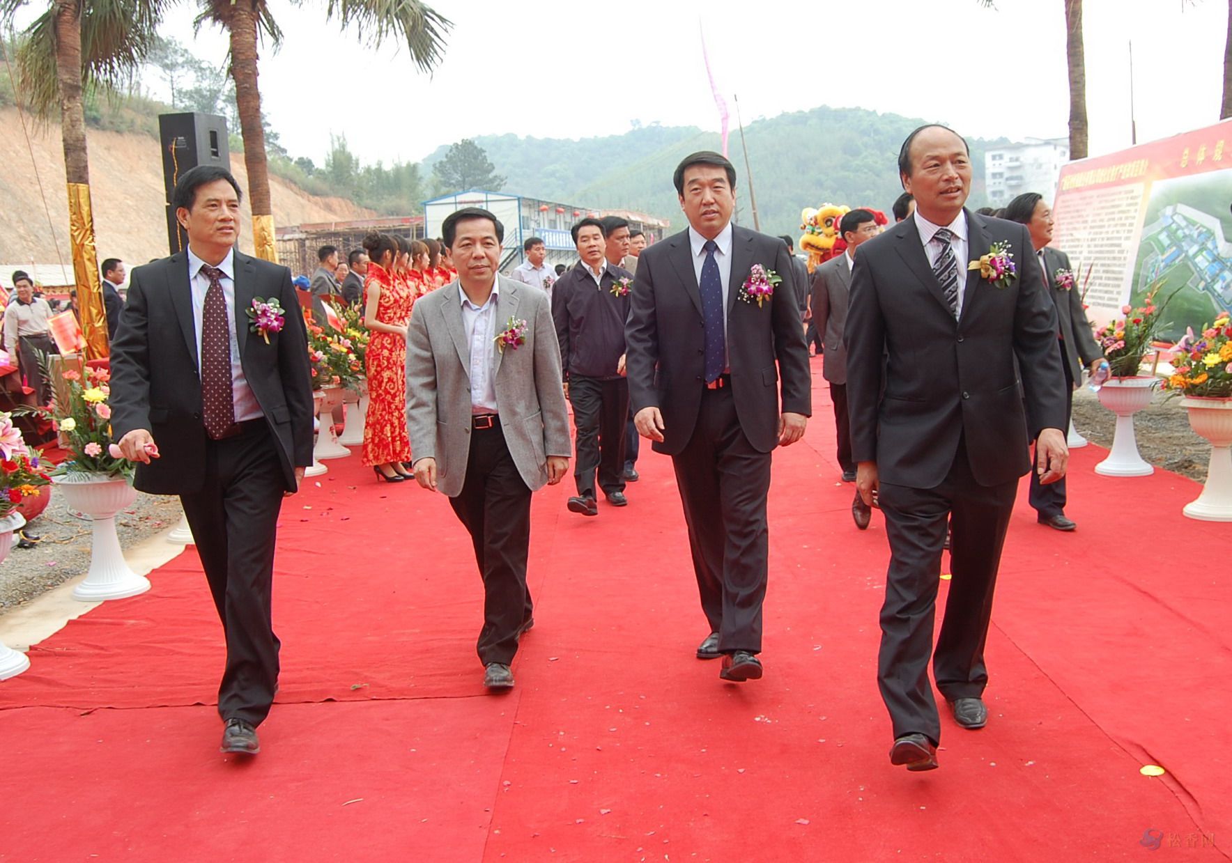 中共梧州市委書記劉志勇(右二)、廣西區(qū)工信委副主任潘峰(左二)于2010年3月31日在廣西梧州松脂股份有限公司歧化擴產(chǎn)技改投產(chǎn)慶典儀式上與公司董事長孔仕才(右一)總經(jīng)理車乾池(左一)在一起。