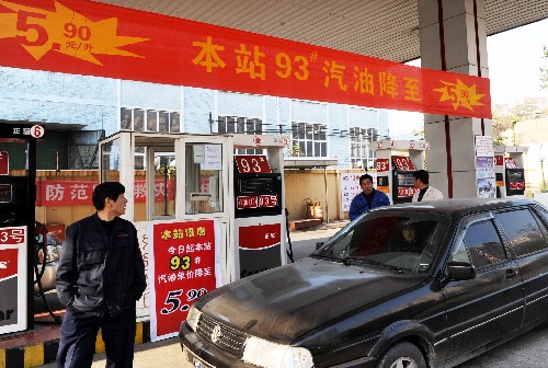 11月12日,一位車主正在青島市興隆路一加油站加油。 受近期國(guó)際油價(jià)暴跌和國(guó)內(nèi)成品油批發(fā)價(jià)格下調(diào)等因素影響,青島部分民營(yíng)加油站開(kāi)始下調(diào)汽油零售價(jià)格,93號(hào)、97號(hào)汽油分別下調(diào)0.06元至0.29元不等。 新華社記者 李紫恒 攝