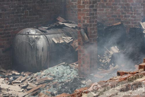 火場面積約有400平方米,化工廠內(nèi)的情況十分嚴(yán)峻。消防員們頂著高溫向局部蔓延的大火發(fā)起“攻擊”。突然間,聚集在東面墻角的松節(jié)油桶發(fā)生爆炸。