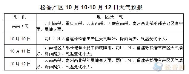 華訊松香網(wǎng)提醒:未來三天除川南及云貴西部地區(qū)持續(xù)陰雨天氣外,粵桂閩贛等其他產區(qū)天氣晴好,且高溫天氣基本退去,較利于松脂采收工作的進行。當前總體天氣情況較利于松脂的釋放,從目前市場看來,雖然各地松脂價格跟隨香價較前期有一定幅度上調,松脂量尚未出現(xiàn)大幅釋放,隨著天氣漸涼,松脂將趨于減少,不排除后期有部分脂農及松脂供應商出現(xiàn)惜售囤脂現(xiàn)象。