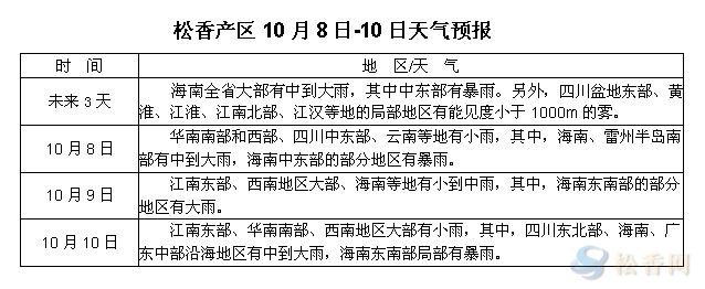 華訊松香網(wǎng)提醒:國(guó)慶節(jié)期間,東南沿海地區(qū)持續(xù)降雨,節(jié)后三天各產(chǎn)區(qū)天氣基本都開始逐漸結(jié)束雨水天氣,部分產(chǎn)區(qū)出現(xiàn)氣溫回升的跡象,較利于松樹出脂,但是整體脂量,及松脂松香價(jià)格走向仍由市場(chǎng)各方因素決定。