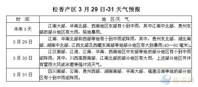 華訊松香網(wǎng)提醒:未來三天,兩廣大部天氣較為晴好,江西福建等東南部降水強(qiáng)度及范圍較大,云南部分地區(qū)有小幅降雨,上山人員應(yīng)根據(jù)天氣情況做好工作計劃。另外,預(yù)計清明節(jié)過后,大部分地區(qū)天氣將趨于晴好,屆時采脂工作將有序進(jìn)行。