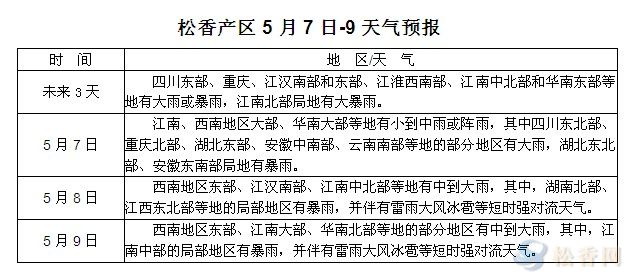華訊松香網(wǎng)提醒:未來三天,華南大部天氣晴好,間有短時(shí)陣雨;閩贛湘滇部分地區(qū)降雨強(qiáng)度較大,或伴雷雨大風(fēng)或冰雹等強(qiáng)對流天氣。據(jù)分析,近日大部分松香產(chǎn)區(qū)天氣較為晴好,利于松樹出脂,請已上山的工人注意安排掛袋采脂時(shí)間。另廣西西南部(百色地區(qū))持續(xù)高溫,局部出現(xiàn)旱情,對于采脂的影響暫未顯現(xiàn),若短期內(nèi)沒有明顯改善,或會影響該地區(qū)新脂的下山時(shí)間。