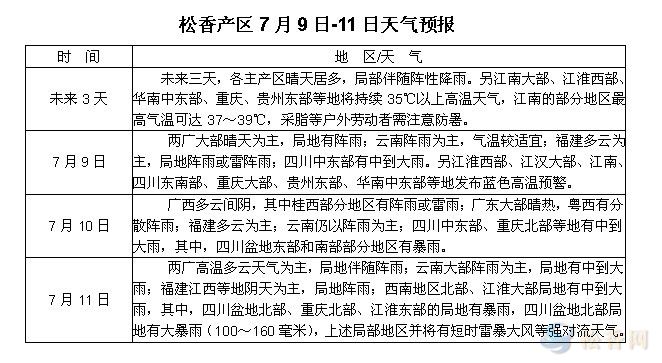 華訊松香網(wǎng)溫馨提醒:未來(lái)三天,各主產(chǎn)區(qū)以多云或晴熱少雨天氣為主,35℃以上的高溫天氣區(qū)域增多,上山人員需注意防暑降溫。另粵西局部、四川部分地區(qū)需注意防御強(qiáng)降水帶來(lái)的地質(zhì)災(zāi)害等影響。隨著產(chǎn)季深入,加上部分產(chǎn)區(qū)高溫伴有陣雨的天氣利于松樹(shù)出脂,本周下山松脂量或會(huì)較前增加,另近日部分地區(qū)松脂價(jià)格略有調(diào)整,對(duì)松脂供應(yīng)商售脂積極性稍有影響,未來(lái)仍需繼續(xù)關(guān)注價(jià)格及天氣等對(duì)到廠松脂量的影響。