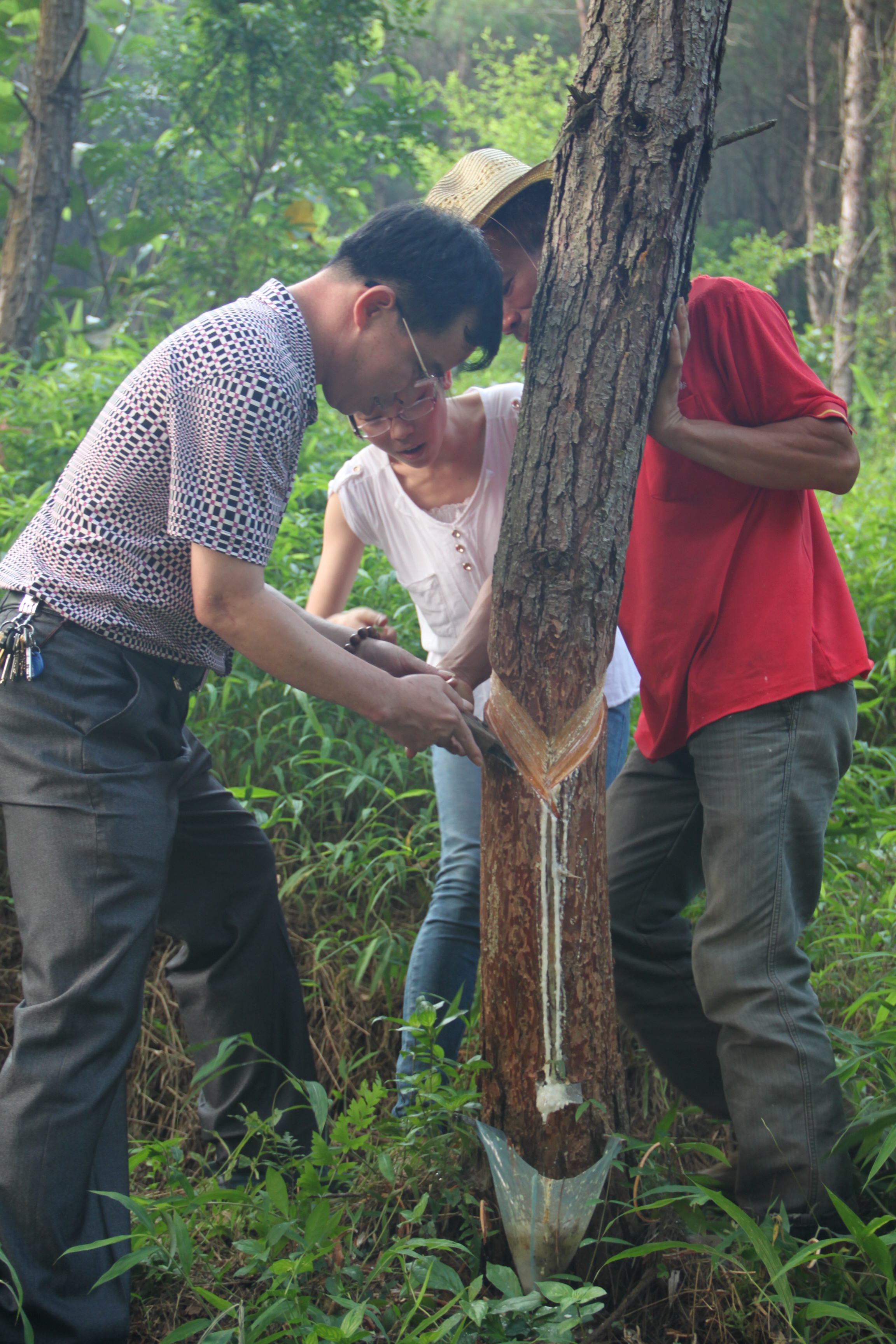 在封開縣的一片松林里,看完脂農(nóng)采脂,我們躍躍欲試,但無從下手。脂農(nóng)從割脂刀的握法、切割手法、力度和方向到切割的長(zhǎng)度、深度,一點(diǎn)一點(diǎn)向我們講解并示范。實(shí)際操作之后才發(fā)現(xiàn),采脂并不像看起來那么容易,處處都是學(xué)問,并且是一件極辛苦的體力活。在有幾十年從業(yè)經(jīng)驗(yàn)的他們面前,我們顯得如此笨拙,引導(dǎo)圍觀的脂農(nóng)笑聲不斷。