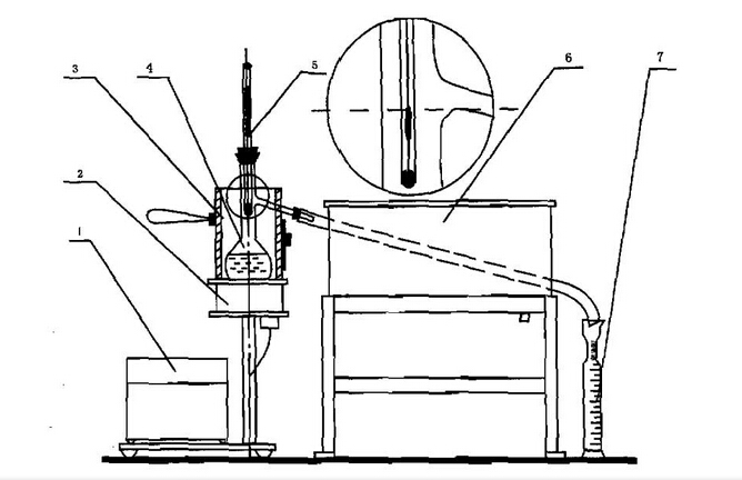 6、初餾點(diǎn)和餾程儀器設(shè)備:(符合SH/T 0121-1992的各項(xiàng)要求)①電器裝置。②電爐。③燒瓶罩。④恩氏蒸餾燒瓶(容量100mL)。⑤溫度計(jì)(棒式局浸式有膨脹室的水銀溫度計(jì),范圍140-200℃,分度值0.5℃)。⑥冷凝管。⑦異徑量筒(容量100mL,)。⑧氣壓計(jì)。⑨石棉墊。⑩鐵架臺(tái)。11秒表。12冷凝器座架。13冷凝器水槽。