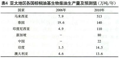 亞太地區(qū)也正在興起生物柴油產(chǎn)業(yè)。到2010年,亞洲將超過(guò)北美,以及中/東歐,成為僅次于西歐的第二大生物柴油生產(chǎn)地。表4列出亞太地區(qū)各國(guó)棕櫚油基生物柴油生產(chǎn)量及預(yù)測(cè)值。