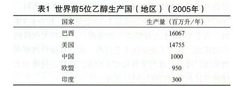 巴西和美國(guó)的燃料乙醇生產(chǎn)量合計(jì)占世界燃料乙醇生產(chǎn)量的90%,兩國(guó)政府自1970年起就大力支持乙醇生產(chǎn)。表1列出世界前5位乙醇生產(chǎn)國(guó)(地區(qū))。