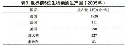 歐盟尤其是德國(guó),主導(dǎo)了世界生物柴油的生產(chǎn)和使用。表3列出世界前5位生物柴油生產(chǎn)國(guó)。