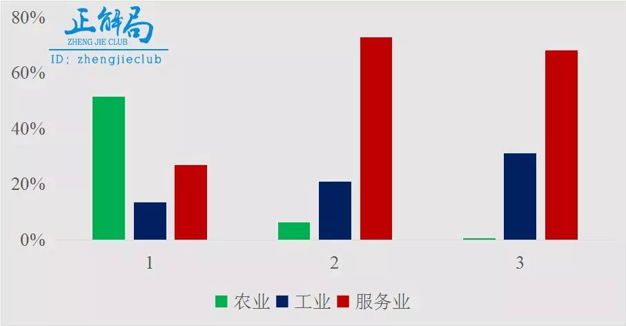 在我們的認(rèn)知里,一二三產(chǎn)業(yè)(簡單對應(yīng)農(nóng)業(yè)、工業(yè)、服務(wù)業(yè)),越發(fā)達所占比重相應(yīng)越來越高。我們能確定國家1是尼泊爾,但是國家2、3呢?