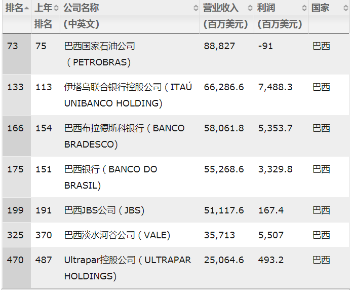 更直觀的反映是,在2018年福布斯世界企業(yè)500強中,巴西一共入圍7家,從名字就能看出來2-4位是金融企業(yè)。剩下的里面,巴西國家石油公司和Ultrapar控股公司,一個主業(yè)是石油,一個是天然氣,JBS是肉食加工企業(yè),淡水河谷是鐵礦石生產(chǎn)和出口商。
