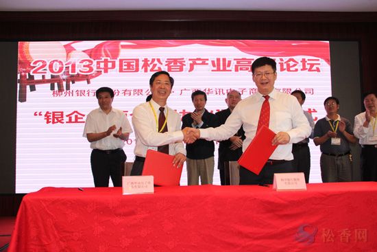 為全面支持松香行業(yè)可持續(xù)發(fā)展,會(huì)上還進(jìn)行了“銀企全面合作”簽訂儀式, 柳州銀行與華訊松香網(wǎng)簽訂合作協(xié)議,向行業(yè)提供30億以上的資金支持,運(yùn)用于電子商務(wù),為行業(yè)提供全方位、多層次的金融服務(wù)。