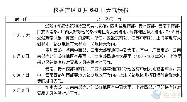 華訊松香網(wǎng)提醒:未來三天受殘余熱帶系統(tǒng)和冷空氣共同影響,兩廣、云貴等地局部有大到暴雨,松脂采收工作暫難恢復(fù)。另熱帶風(fēng)暴“海葵”將登陸東部沿海,江浙皖滬等地受影響。本周各主產(chǎn)區(qū)仍多陣雨天氣為主,且不乏短時(shí)暴雨的等天氣,松脂量方面將難有較大改善,對(duì)于部分前期接有8月份訂單的工廠有一定影響,為保證原料供應(yīng),部分地區(qū)工廠或適當(dāng)調(diào)整松脂收購價(jià)格。