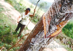 酒杯粗細(xì)的松樹上,被人割了將近1米長(zhǎng)的傷痕,樹皮只保留一半左右,一滴滴地流著汁水。最近以來,我市銅梁、永川、墊江、涪陵等地,至少有1萬畝松林被割皮取油,采割松脂。部分市民昨天發(fā)出呼吁:挽救這些松樹,我市應(yīng)禁止采割松脂。